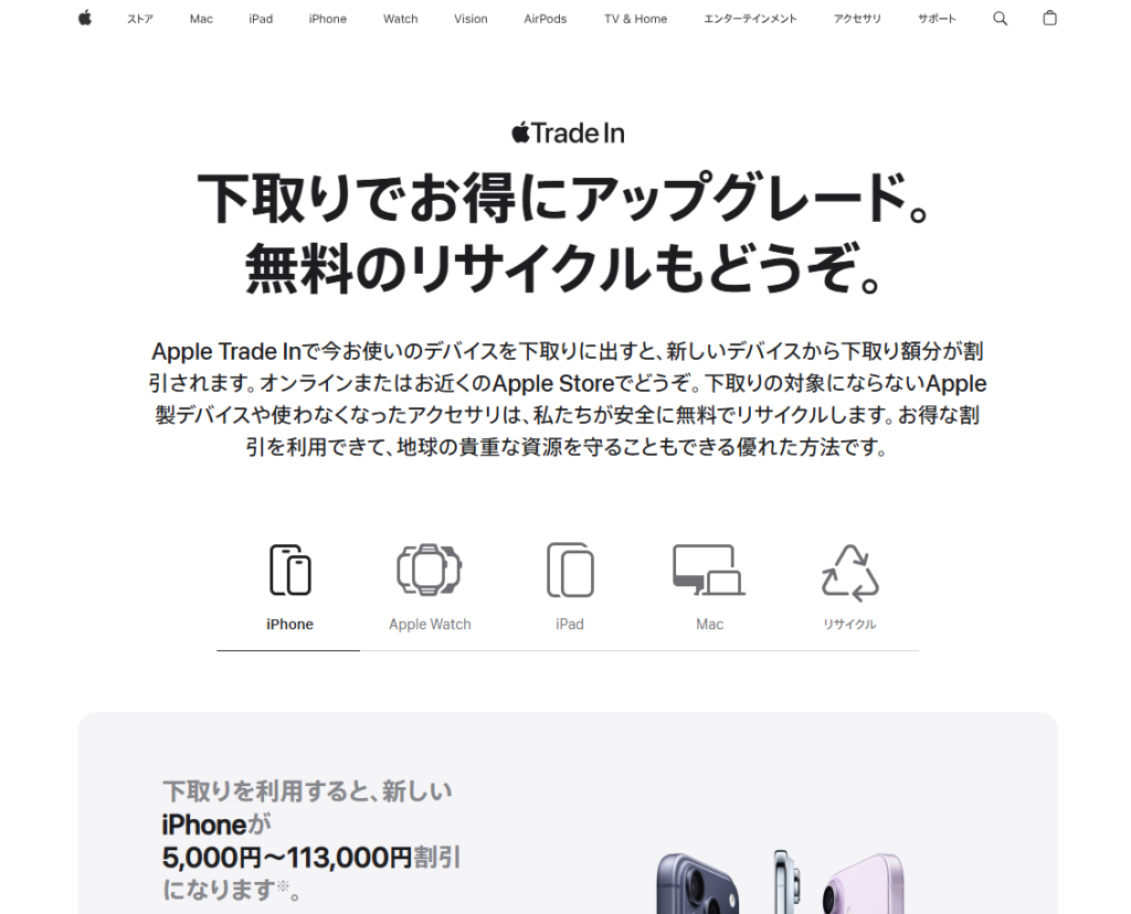Apple公式サイトの「Apple Trade In」ページで、下取り見積もり額を確認します。
