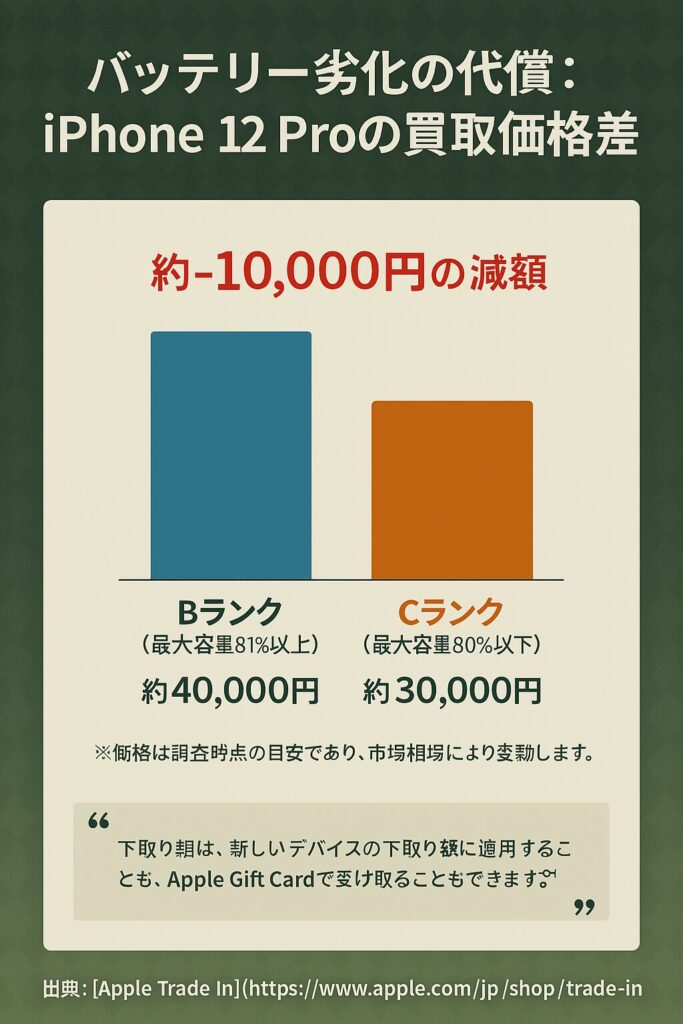 これが「80%の壁」の正体です。あなたのiPhone 12 Proは、バッテリーが78%になった時点で、市場価値として約1万円分が目減りしてしまっているのです。