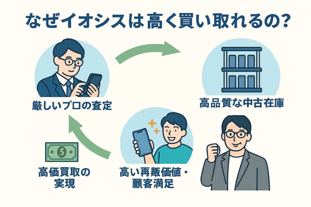 なぜなら、厳しい基準で状態の良い端末だけをしっかりと選別するからこそ、イオシスは再販時に高い価値を維持でき、その利益を原資として、他社より高い買取価格を提示できるのです。